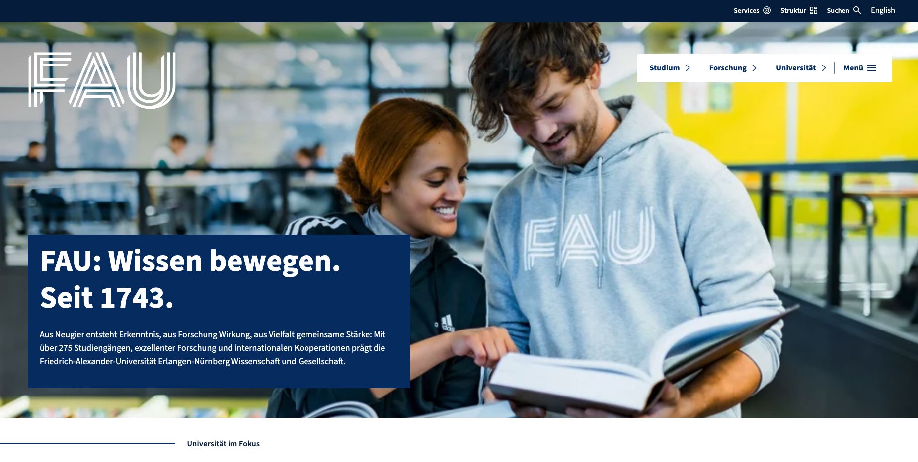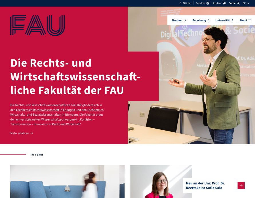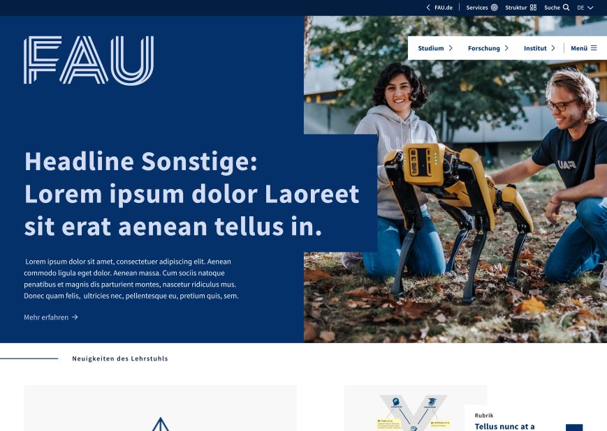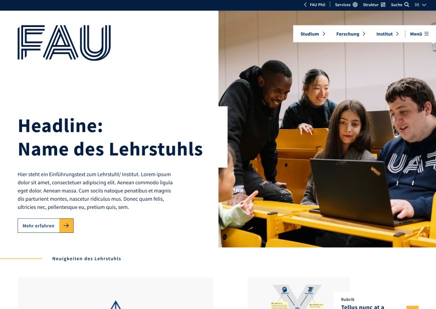 Das WordPress-Theme der Friedrich-Alexander-Universität Erlangen-Nürnberg (FAU) für alle Einrichtungen, Fakultäten, Departments und Lehrstühle ab Winter 2025/Frühjahr 2026. Aktuelle Informationen sowie Häufig gestellte Fragen zum Webrelaunch finden Sie auf unserer Intranetseite zum Projekt: