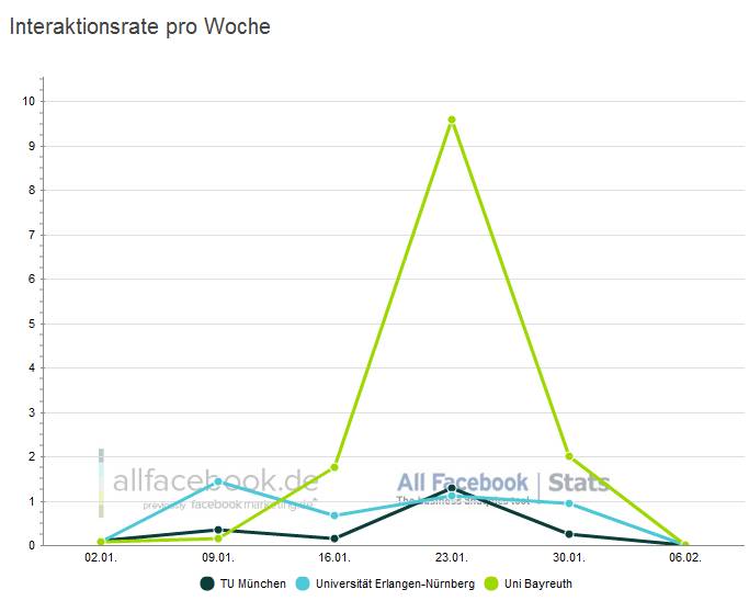 Die Grafik zeigt die Interaktionsraten für Facebook-Angebote der Pressestelle der FAU, der Pressestelle der Universität Bayreuth und der TUM. (http://allfacebook.de/tracking/TU.Muenchen+Uni.Erlangen.Nuernberg+UniBayreuth ).