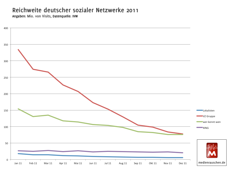 Bis vor wenigen Monaten waren die „VZ-Netzwerke“ (StudiVZ, SchülerVZ und meinVZ) der Verlagsgruppe Georg von Holzbrinck ebenfalls noch relevant. Aufgrund des Erfolgs von Facebook, Twitter und Google+ verloren sie 2011 jedoch massiv an Nutzerzahlen und Reichweite.