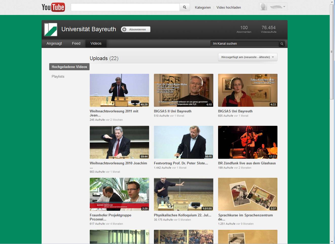 Zu erwähnen ist darüber hinaus die Videoplattform „YouTube“. Sie nimmt zwar nicht die Stellung eines klassischen sozialen Netzwerks ein, wird jedoch durch diese mehr oder weniger stark eingebunden. Sogenannte „Kanäle“ erlauben sowohl privaten Nutzern als auch Einrichtungen und Organisationen die Präsentation eigener Videos. Einige Universitäten machen hiervon regen Gebrauch. So u.a. die Universität Bayreuth.