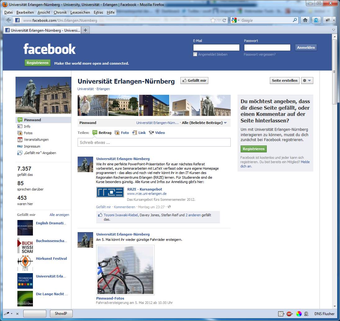 | Technische Fakultät (Dekanat / Öffentlichkeitsarbeit) | http://www.facebook.com/pages/Universit%C3%A4t-Erlangen-N%C3%BCrnberg-Technische-Fakult%C3%A4t/159695617395190 | Manueller Hinweis auf ausgewählte Nachrichten sowie Reaktion auf Kommentare und Anfragen |