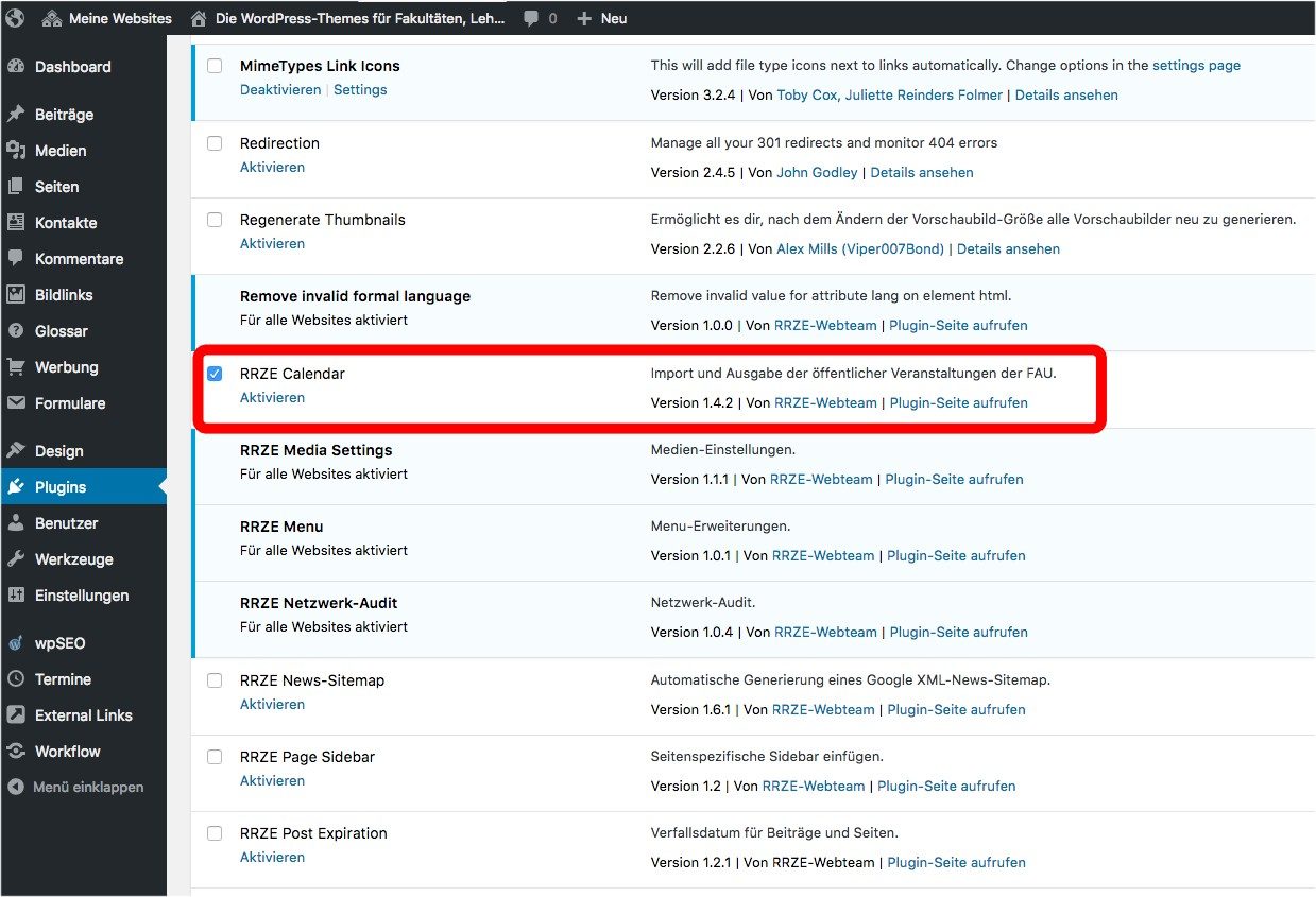 - Aktivieren Sie das Plugin „RRZE Calendar“.