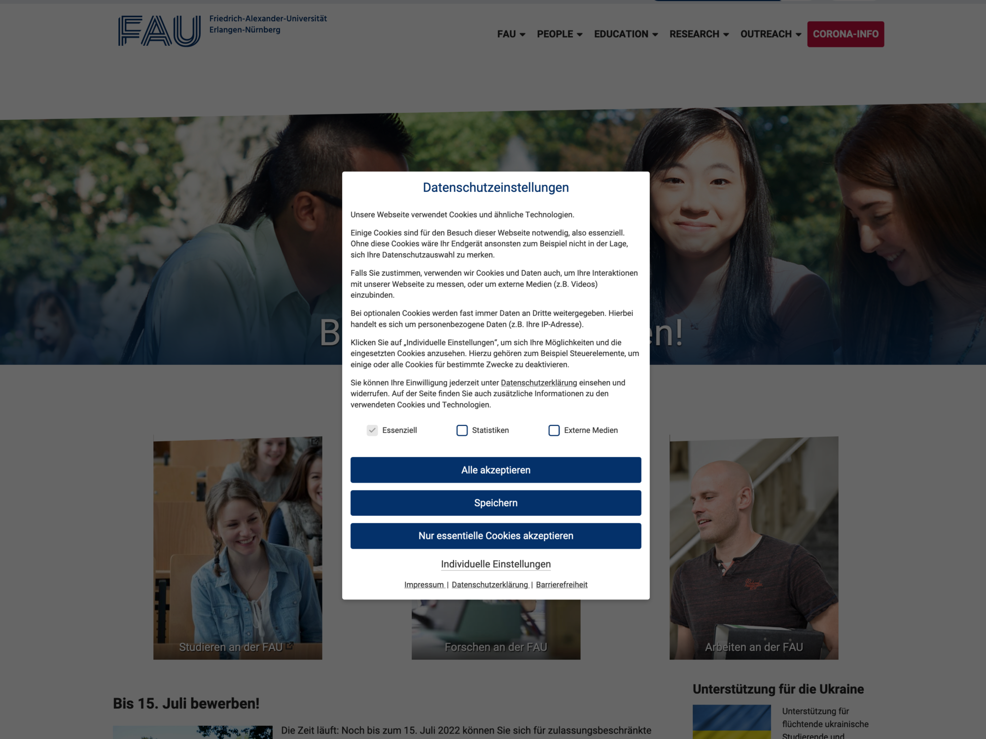 Seit gestern wird auf www.fau.de, www.fau.eu sowie auf weiteren Websites ein Consent-Banner angezeigt.