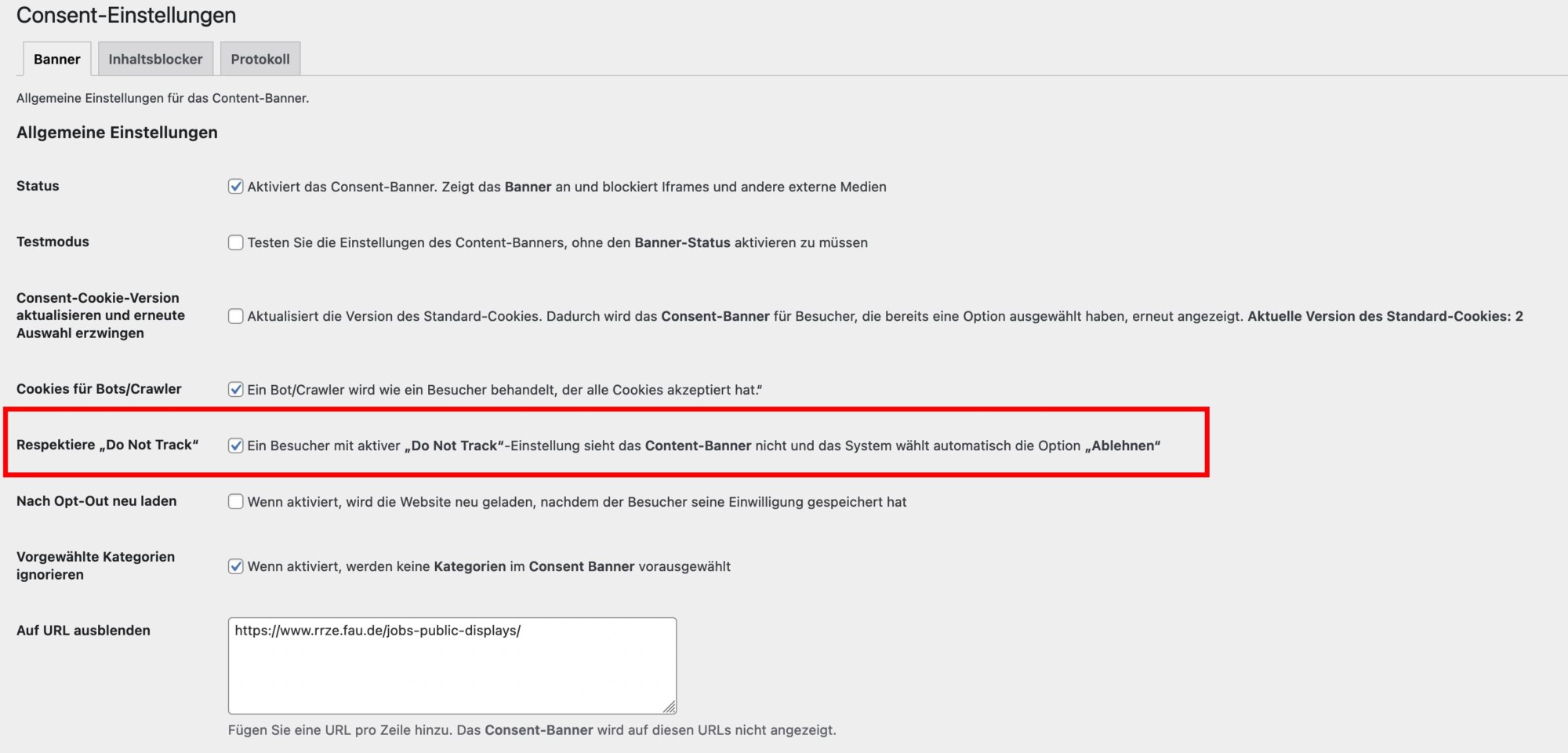 Wir werden bei der Aktivierung im August jedoch die Option „Do Not Track“ berücksichtigen in der Form, dass diese Angabe als Ablehnen aller zustimmungspflichtigen Cookies interpretiert wird. Der Consent-Banner wird bei einem im Browser aktivierten „Do Not Track“ nicht erscheinen. Will man trotz „Do Not Track“ doch noch ein Einstellungen ändern, um beispielsweise YouTube Videos auf einer Website zu sehen, kann man dies unter den Datenschutzeinstellungen tun.