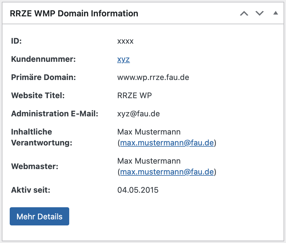 Das neue RRZE WMP Plugin bringt wichtige Domain- und Kontaktinformationen direkt in das WordPress Dashboard. Entwickelt für eine bessere Übersichtlichkeit und Verwaltung von Webauftritten, zeigt das Plugin automatisch relevante Daten aus dem Web Master Portal (WMP) an.