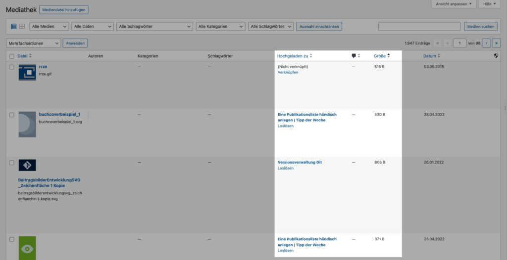 - Beachten Sie in der Listenansicht der Mediathek die Spalte „Hochgeladen zu“ – nicht verknüpfte Dateien sollten Sie entfernen