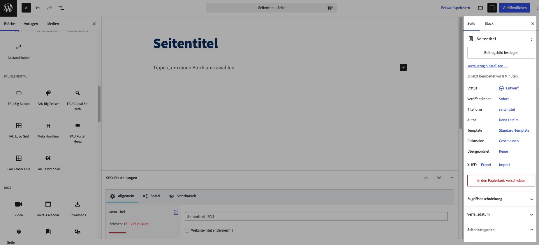 - Veröffentlichen: Hier können Sie festlegen, ob die Seite oder der Beitrag sofort oder zu einem späteren Zeitpunkt veröffentlicht werden soll.