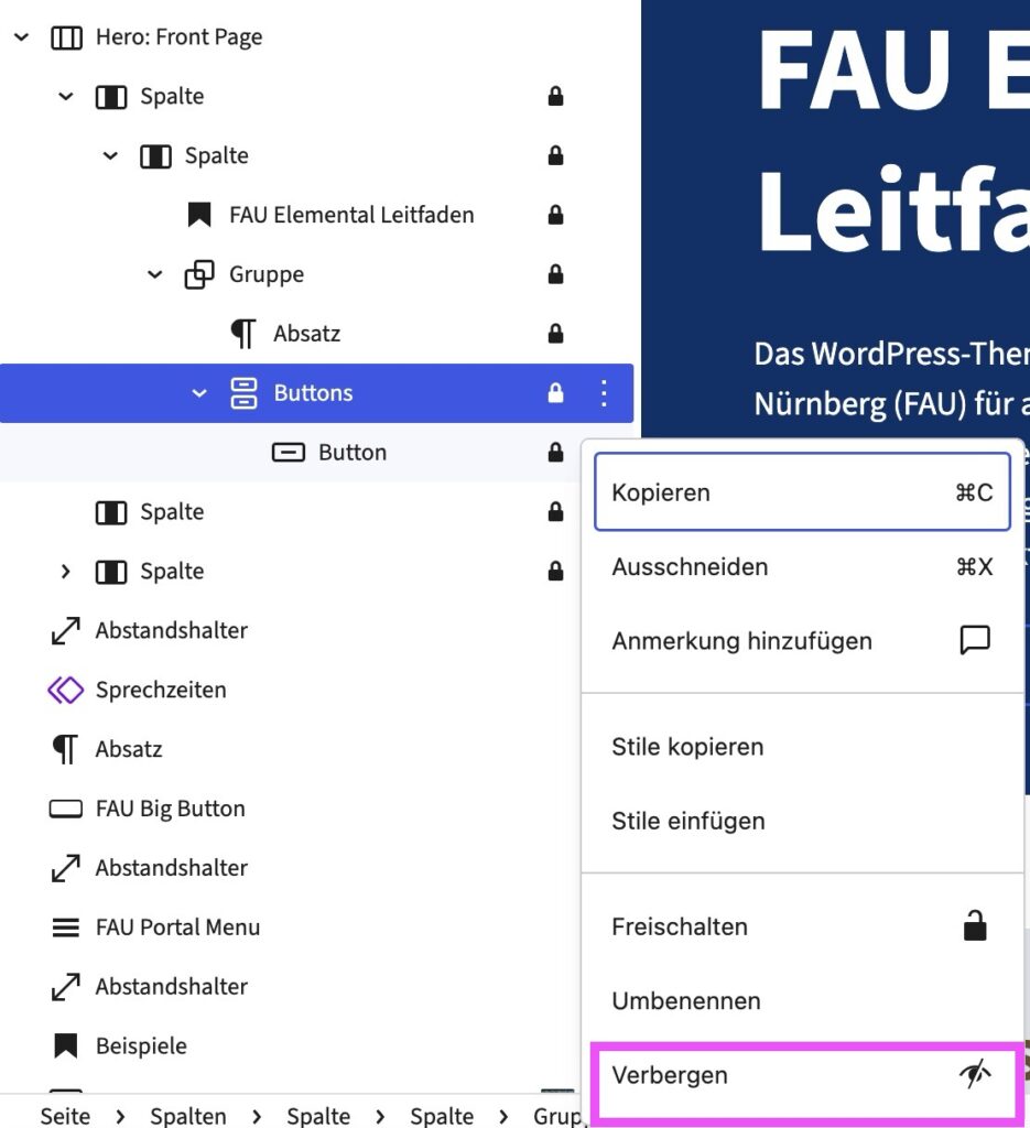 - In der Listenansicht sollte der Hero: Front Page nun aufgeklappt sein, sodass Sie die einzelnen verschachtelten Ebenen sehen können.