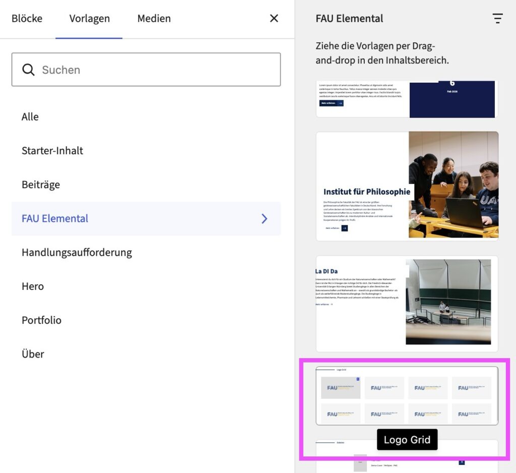 - In der Kategorie FAU Elemental finden Sie alle zum Theme relevanten Designvorlagen.