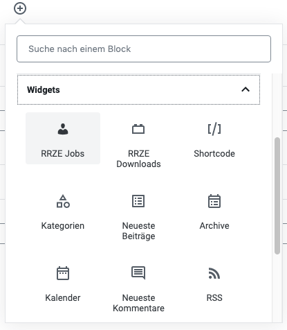- Die Blockauswahl öffnet sich. Suchen Sie nach „RRZE Jobs“.