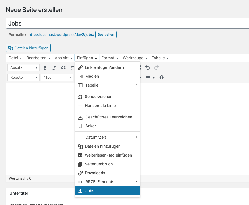 Im Bearbeitungsmodus „Visuell“ finden Sie den Menüpunkt „Jobs“ unter „Einfügen“. Wenn Sie ihn wählen, wird der Shortcode mit dem Pflicht-Attribut im Editor ausgegeben.