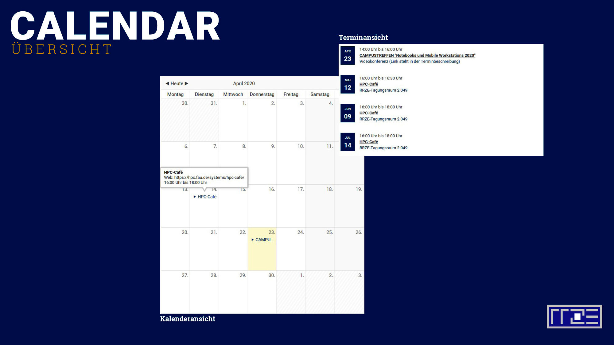 Das Calendar Plugin bietet Ihnen die Möglichkeit, schnell und übersichtlich Termine zu Veranstaltungen, Prüfungsterminen und weiteren Daten in Ihren Webauftritt einzubinden: