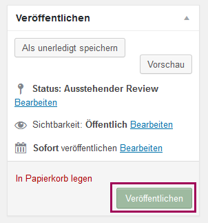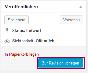 Wenn ein Autor eine Seite oder einen Beitrag erstellt, kann er ihn nicht selbst veröffentlichen, sondern muss ihn einem Redakteur zur Revision vorlegen. Das sieht in der Ansicht des Autors so aus: