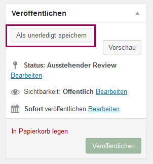 Im Status Ausstehende Überprüfung erscheint der Button „Als ausstehend speichern“. Wenn eine Seite oder ein Beitrag als ausstehend gespeichert wird, erscheint Sie unter Dashboard | Alle Seiten | Ausstehend und kann dann nach Überprüfung zur Veröffentlichung freigegeben werden.