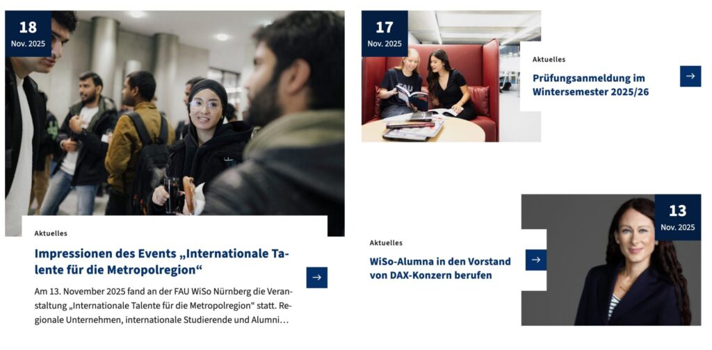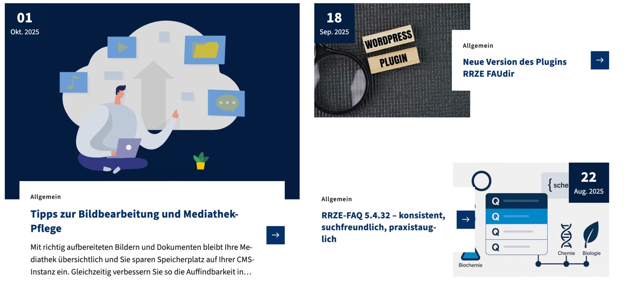 Der neue Block FAU Teaser Grid wird zur Anzeige der neuesten Beiträge oder bestimmter Seiten verwendet. Wenn Sie zuvor den Block Beitragsübersicht (Custom News Block) verwendet haben, wird dieser bei der Umstellung automatisch ins Teaser Grid umgewandelt.