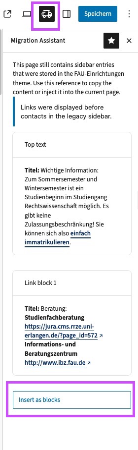 Das FAU Elemental Theme unterstützt keine Seitenleisten mehr. Die dynamisch generierten Seitennavigationen finden Sie nun im Hauptmenü. Die Sidebar-Inhalte wie Kontakte und Veranstaltungen können Sie mit der neuen Funktion „Migrationsassistent“ in Ihren Inhaltsbereich übertragen werden.