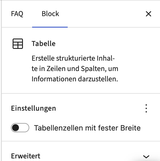 - Markieren Sie den Tabellenblock. In der rechten Seitenleiste sehen Sie nun die Block-Einstellungen.