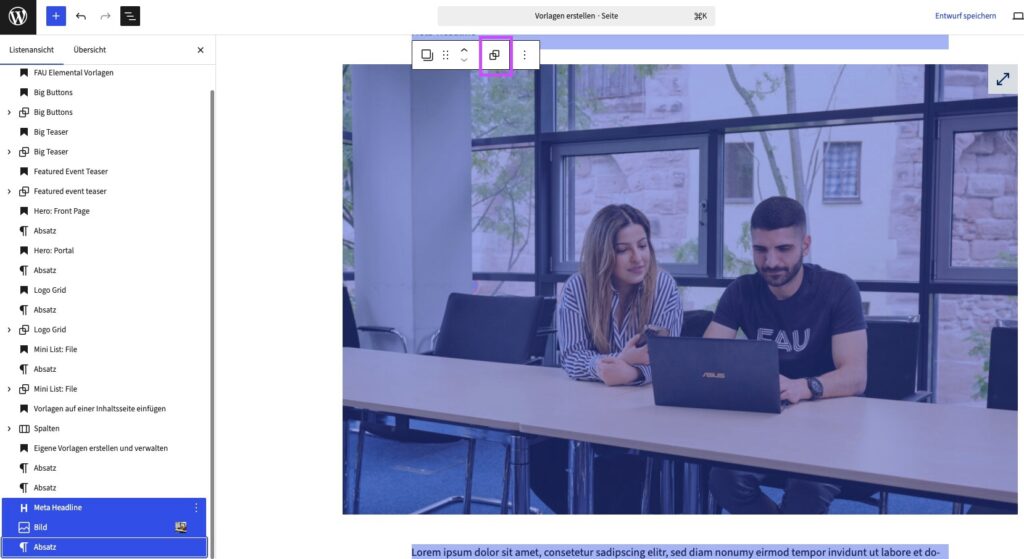 - Um die Vorlage zu bearbeiten, markieren Sie die Vorlage und wählen Sie in der Block-Werkzeugleiste die Option Original bearbeiten.
