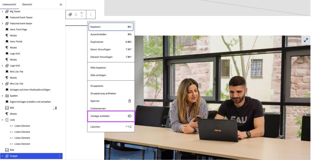 Vorlagen sind wiederverwendbare Layout- oder Blockstrukturen, mit denen Sie Ihre Inhaltsseiten schnell und einheitlich aufbauen können. Oft zusammen genutzte Elemente können Sie auch selbst als Vorlage speichern. Selbstverständlich können die Vorlagen nach Ihren Wünschen angepasst werden.